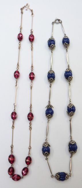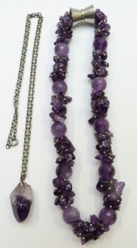 A collection of jewellery including amethyst necklace, silver chain, quartz, silver brooch in the form of a horseshoe, crop and horse, etc