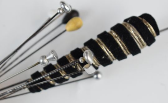 Three hallmarked silver napkin rings including a pair, hallmarked silver lidded condiment, similar silver plated lid and a small collection of hat pins, weight of napkin rings 74g