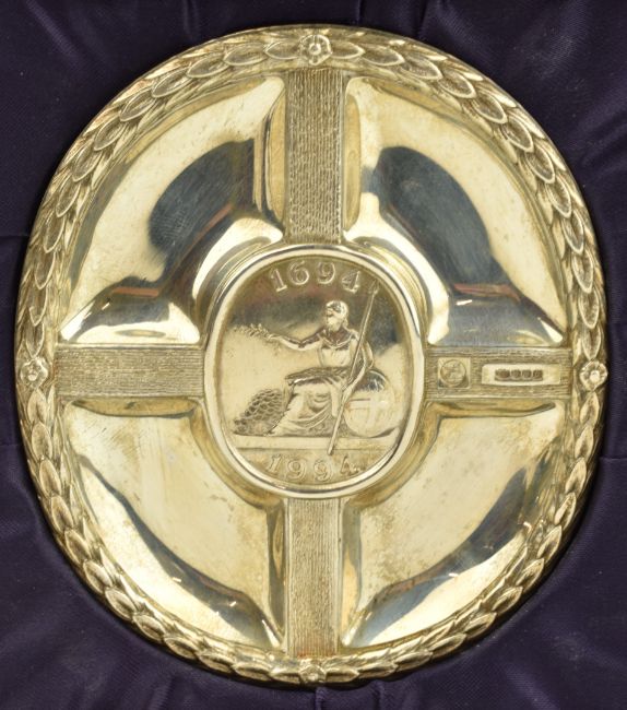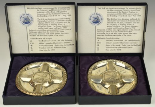 Pair of Bank of England hallmarked silver pin dishes to commemorate the 300th anniversary of the founding of the bank, Sheffield 1994, maker Christopher Lawrence, maximum diameter 11cm, weight 132g