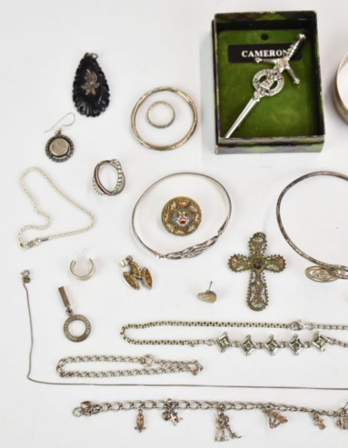 A collection of mainly silver jewellery including bangles, Cini silver earrings, bracelets, two rings, earrings, silver necklace, Longchamp pendants, micro mosaic pendant and brooch, jet pendant mounted with a silver plaque in the form of a squirrel and acorns, Art Deco style silver ring, etc