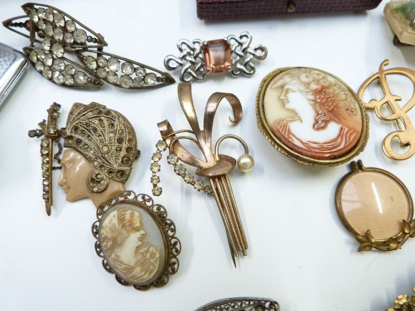 A collection of silver jewellery including silver necklace, Miracle brooch, watches, filigree earrings, filigree bracelets, rolled gold bracelet, Victorian brooches, etc
