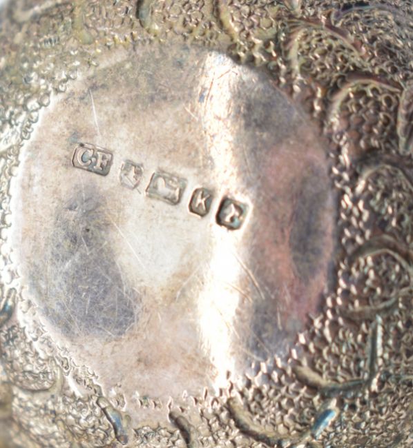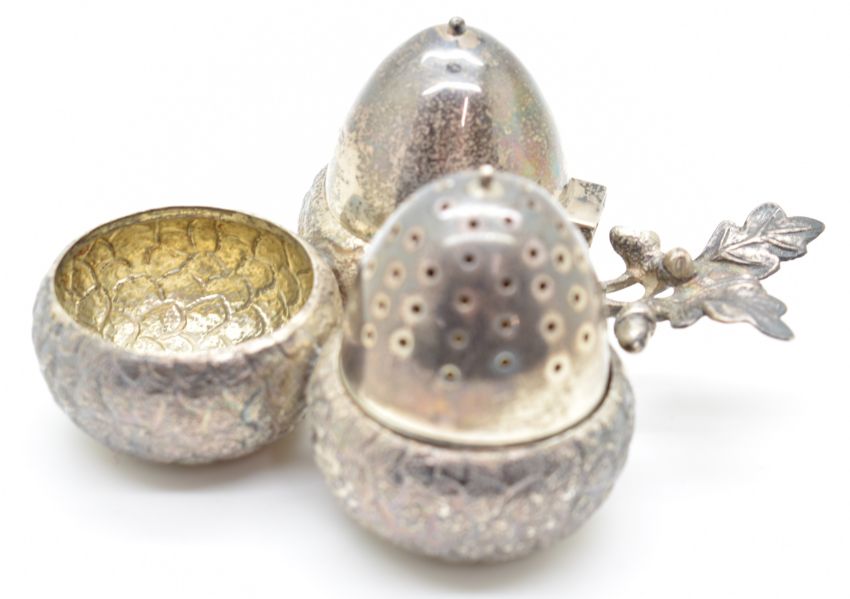 Victorian novelty hallmarked silver cruet set formed as acorns, the pepper being removable, with oak leaf handle, London 1899, maker Pairpoint Brothers, length 13cm, weight 153g