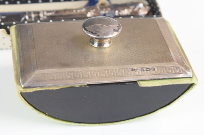 Art Deco hallmarked silver mounted desk blotter, Birmingham 1928, maker Sanders & Mackenzie, together with three hallmarked silver handled King's pattern items