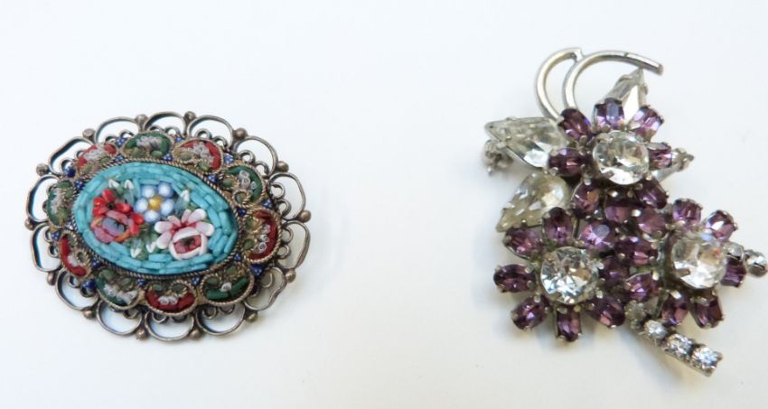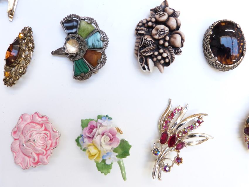 A collection of brooches including 1950's, micro mosaic, silver set with agate, filigree, dog, Toledo, Miracle, marcasite, French silver, silver and agate, Sphinx, silver Tribal brooches, etc