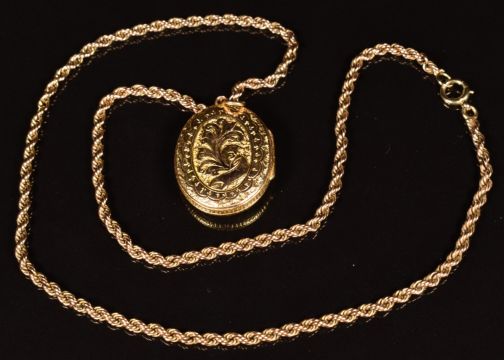 Victorian yellow metal locket with foliate decoration, on 9ct gold rope twist chain, 13.6g