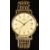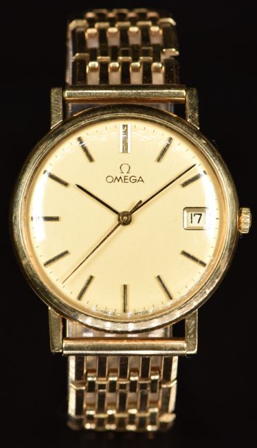 Omega 9ct gold gentleman's wristwatch ref. 132.5017 with date aperture, black and gold hands and baton hour markers, gold dial and signed 17 jewel calibre 1030 movement, on 9ct gold bracelet, case diameter 33mm, serial number 41486532, 46.2g, in original box.