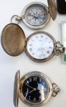 A collection of jewellery and coins including necklace, Art Deco paste earrings, pocket watches, boxed Maurice Lacroix and Rotary watches, two USA silver dollars, silver handled button hook, silver 'Most Cheery Order of Merrythoughts' medallion on chain with wishbone, faux gold bar / ingot, etc