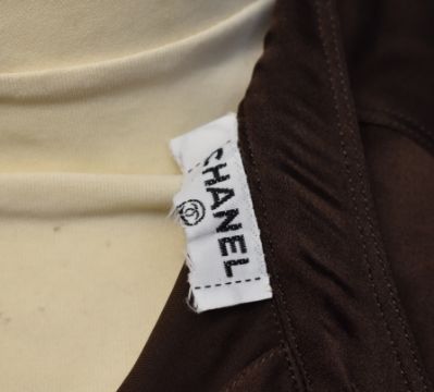 Vintage blouse with Chanel label and button to the collar. Consigned by a former employee of Chanel
