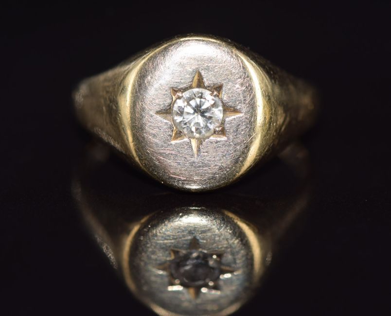 A 9ct gold ring set with a diamond of approximately 0.28ct in a star setting, 6.9g, size Q