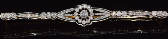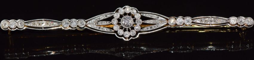 French Belle Epoque 18ct gold brooch set with diamonds, the largest approximately 0.2ct, in a platinum setting, 8.0g