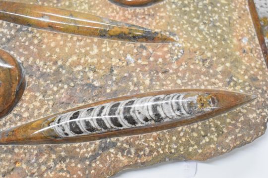 Large fossil sample with ammonites and orthoceras etc, 43 x 32cm