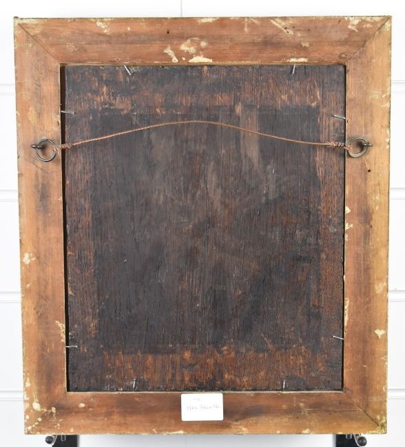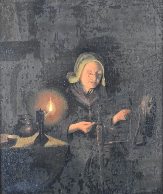 19thC continental oil on board spinning wool by candlelight, 29 x 24cm, in gilt frame