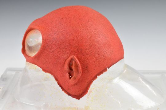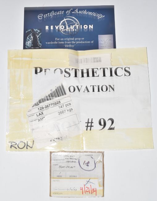 Hellboy film or movie skullcap on vacuum formed base marked Perlman, length 45cm together with certificate of authenticity, mailing label and production notes.