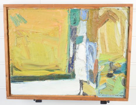 Attributed to Michael Finn (1921-2000) oil on board abstract study, indistinctly signed, titled and dated 1960 verso, 32 x 41.5cm, in pine frame