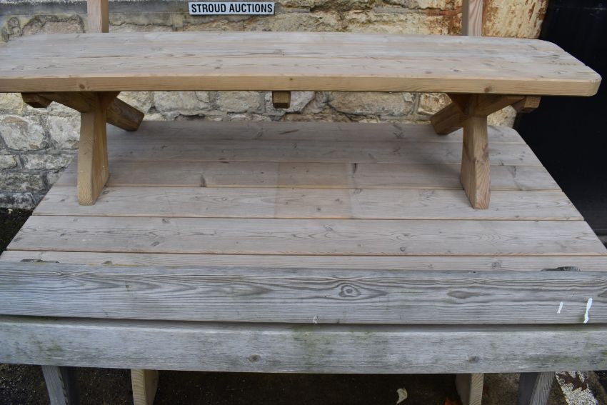 Pine garden table and two bench seats, W160 x D88 x H75cm