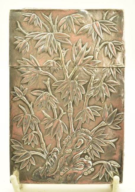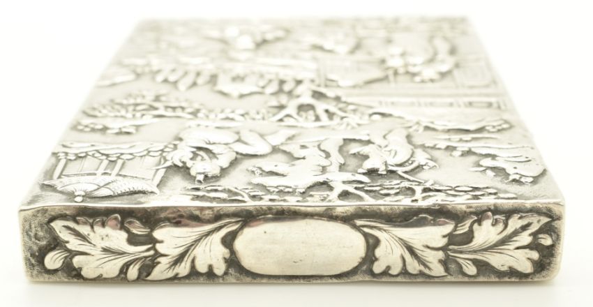 Chinese silver card case with embossed decoration of figures in a traditional landscape with buildings and pine trees, height 10cm, weight 82g