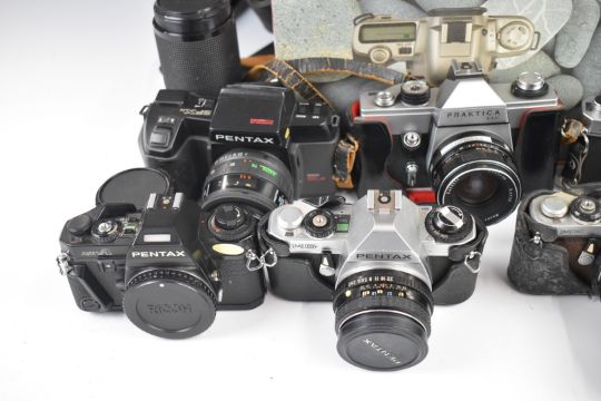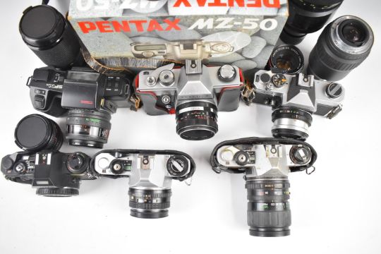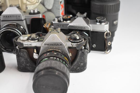 Eight 35mm SLR cameras comprising Fujica AZ-1 with 1:2.2 55m lens, Praktica LLC with 1.8/50 lens, Minolta Dynax 3xi with 35-70mm lens, Pentacon 4/300 lens, Pentax MRE with 28-70mm 1:3.5-4.8, Pentax MG with 1:2 50mm lens, Pentax SFXN with 35-70 and 70-200 lenses and Pentax MZ-50 with 35-80 lens and further Miranda and Kenlock lenses