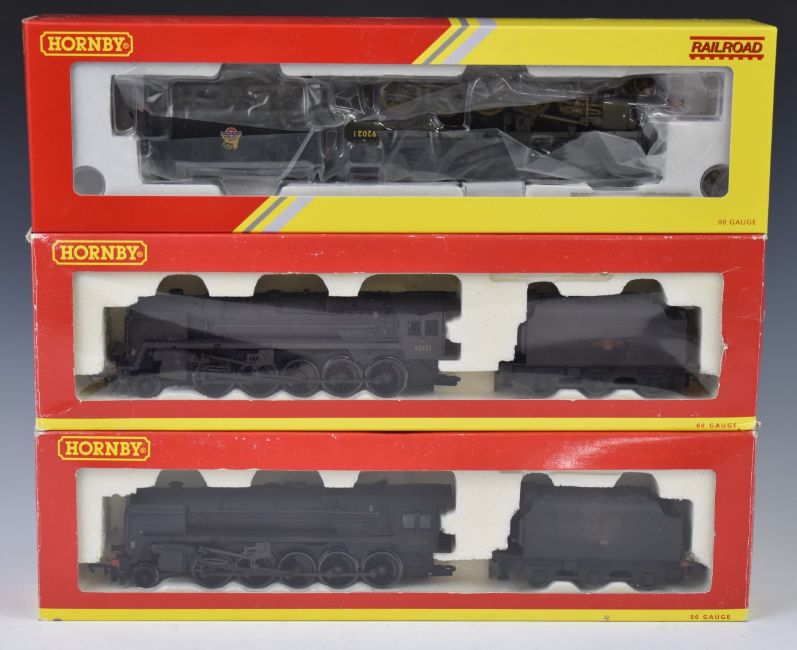 Three Hornby 00 gauge BR Class 9F model railway locomotives 92151 R2200A, 92134 R2200A and 92021 R3356, all in original boxes.