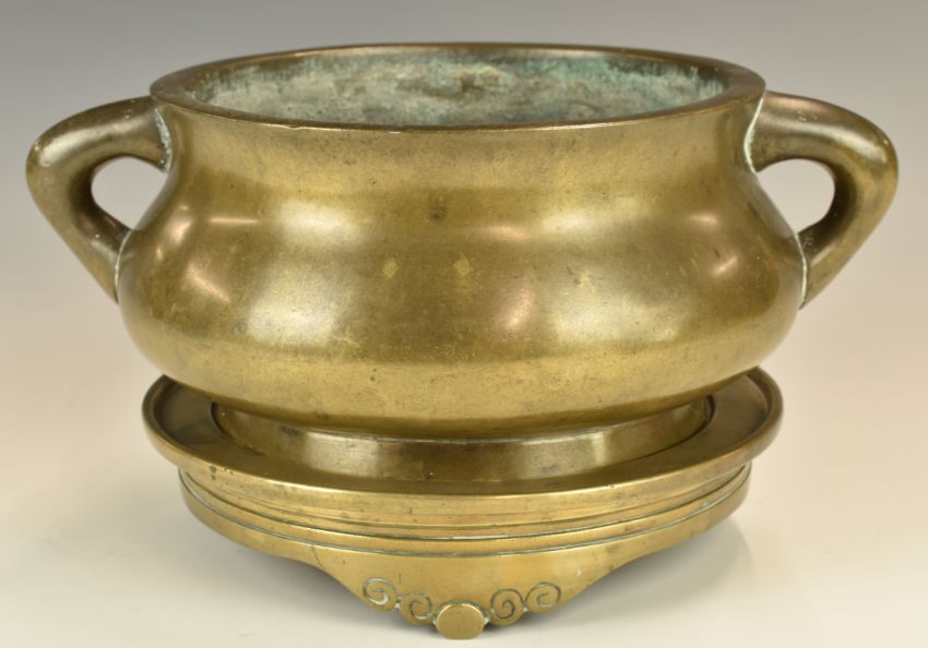 19thC Chinese bronze twin handled pedestal censer, with seal mark to base, on a stand with scrolling decoration, raised on three feet, maximum diameter 25cm, height on stand 13.7cm