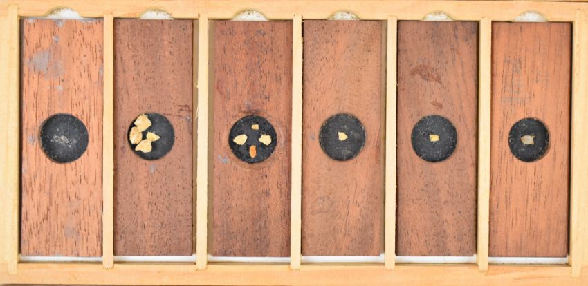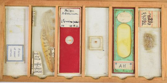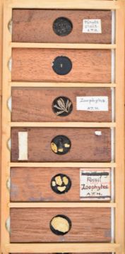 Case of approximately 42 late 19th or early 20thC microscope slides to include moth eggs, locust wings, fossils and shells