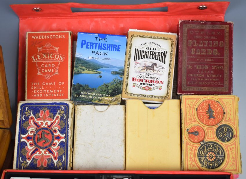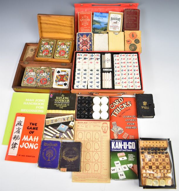 Playing cards and games to include square cornered 19thC part pack, in part slip case with markers, Isle of Man interest packs, Ocean to Ocean (Canada) by Charles Goodall & Son Ltd Revelation fortune telling playing cards, Mah Jong, England's Glory card game markers and card tricks book by Owen Grant
