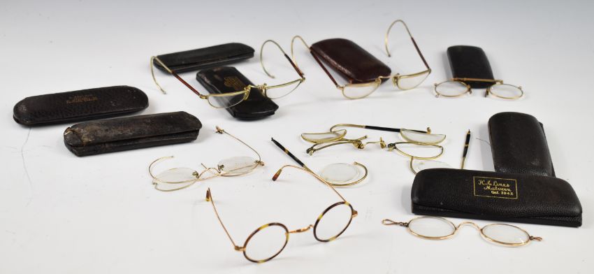 Eight pairs of late 19th or early 20thC vintage gold, tortoiseshell and similar spectacles, in cases to include Penarth, Malvern, Lancaster, Bath, Gloucester and Cardiff