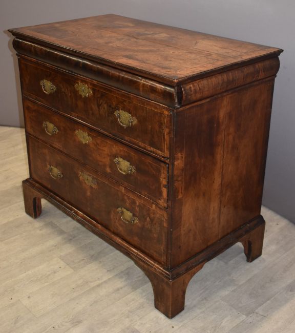 Queen Anne inlaid, quarter veneered walnut chest of three graduated drawers with cockspur detail, raised on bracket feet, W96 x D55 x H88cm
