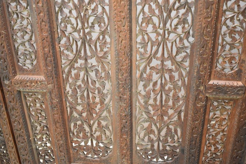Oriental pierced / carved hardwood trifold screen, width extended 210cm x height 185cm