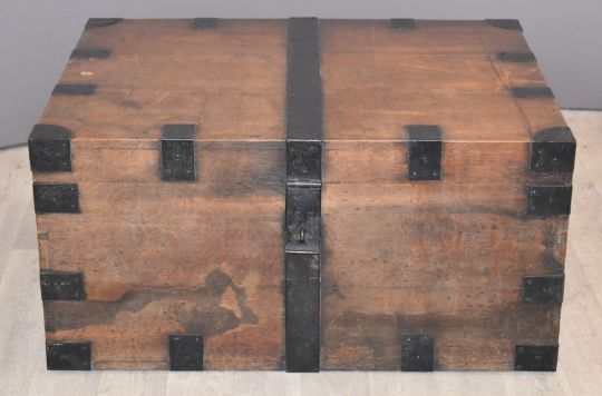 Large metal bound campaign style silver or travelling trunk with fitted interior, W96 x D76 x H48cm