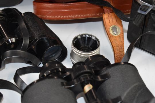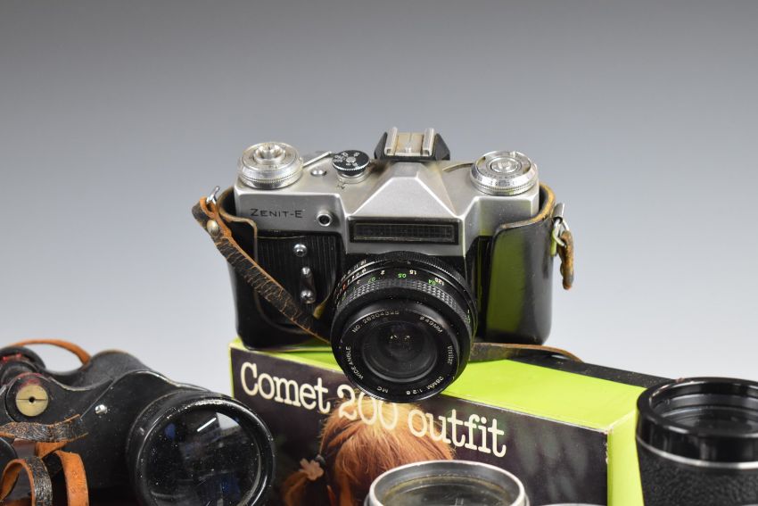 Cameras and binoculars to include Zenit EM 35mm SLR camera with 2/58 lens, Zenit-E with 28mm 1:2.8 lens, Voigtlander Bessa I, Kodak Retina folding camera, Halina 35X, Boots Comet 200 outfit, Swift 8x40 binoculars and Mark Scheffel 35x50 binoculars and an Otis King spiral slide rule