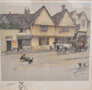 Cecil Aldin (1870-1935) pair of signed coloured lithographs from the Old English Inns series - The Grange Inn, Dorchester and Pomfret Arms Towcester, published Eyre & Spottiswoode with Fine Art blind stamps and both signed in pencil lower margins, one with hand coloured original sketch by the artist alongside signature, 35 x 40cm and 40 x 38cm, both framed and glazed, one with original printer's and framer's labels dated 1927