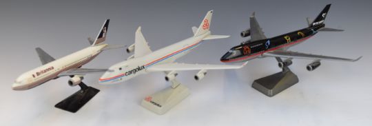 A collection of snap fit and diecast military and commercial model aircraft, all on display stands.