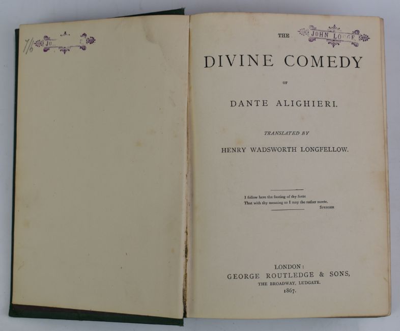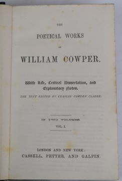 [Bindings] British Poets: John Dryden, Sir Walter Scott, William Cowper, John Milton, Alexander Pope, Young, Goldsmith, Collins & Warton including Memoirs, Notes etc published Cassell, Petter & Galpin (c1880s) uniformly bound in half leather with raised bands, gilt tooling and two coloured leather labels with gilt titles. Dante's Divine Comedy Trans by Longfellow 1867 in gilt decorated cloth with colour floral onlay (8)