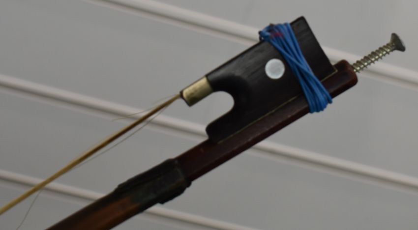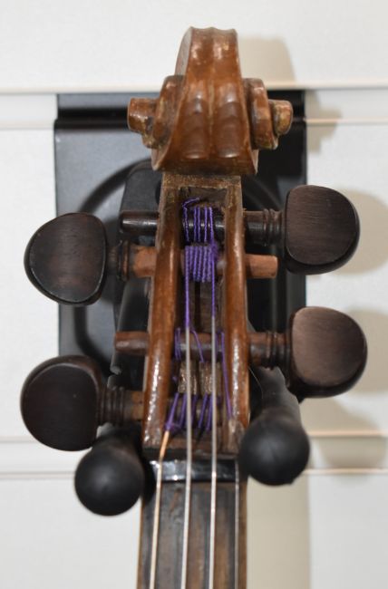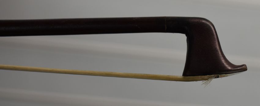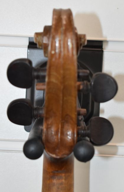 Anonymous two piece back violin with two bows, overall length 60cm, body 36.4cm, lower bout 20.8cm, upper bout 16.6cm, bow 1 length 74.5cm, weight 60g, bow 2 length 74cm, weight 60g, with case