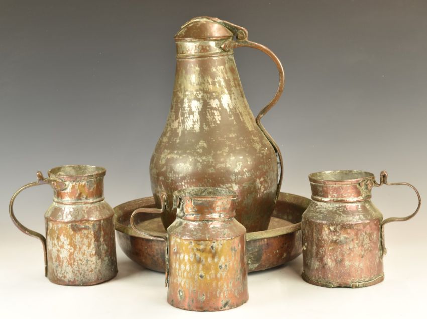 Collection of African tribal copperware including large dishes, covered jug etc, tallest 38cm