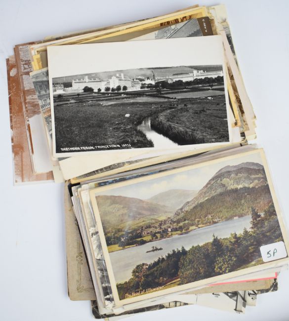 Early 20thC postcards, loose and in an album, including battleships, railway steam locomotives, Donald Mcgill humorous, Canvey Island and Newcastle on Tyne, together with a religious interest carte visite type album