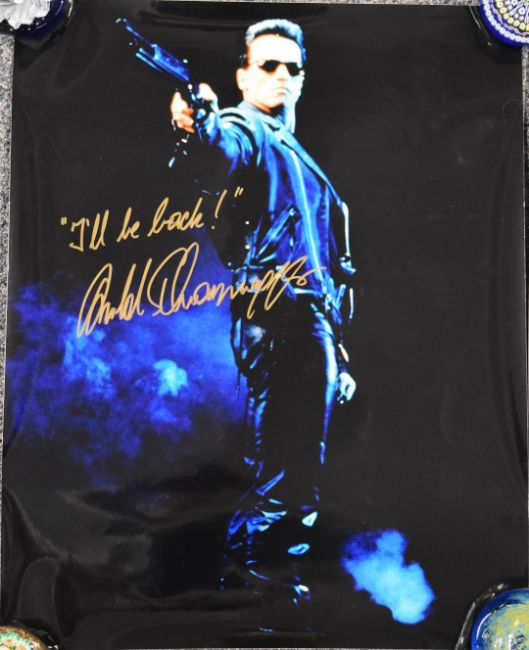 Two Arnold Swarzenegger autographed movie or film photographs, both also with catchphrase "I'll be back" 50.5 x 40.5cm