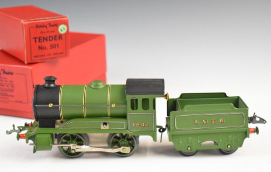 Hornby 0 gauge clockwork NE 0-4-0 tank locomotive and tender 1842, in original boxes.