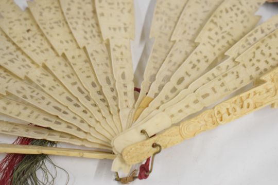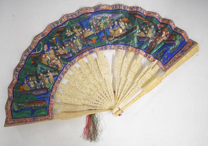 A 19thC Chinese carved bone fan with figural watercolour decoration, length of guard sticks 28cm