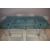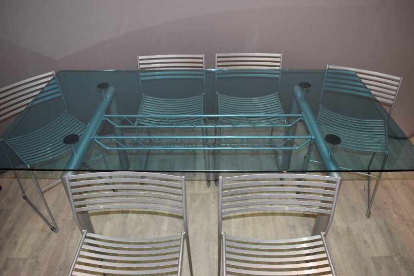 Designer glass dining table and six chairs with industrial gantry stretcher, raised on four circular legs, probably Heals, W181 x D90 x H76cm