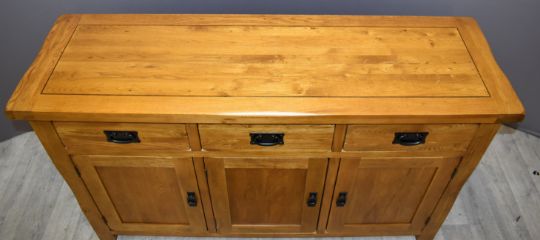 Contemporary solid oak sideboard with three drawers and cupboards, W139 x D42 x H83cm