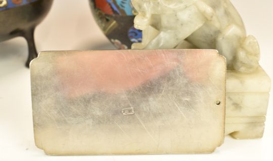 Chinese cloisonné censer, pot pourri, Dogs of Fo, soapstone figures, white metal ingot and a porcelain pin dish with turtle inside etc, tallest 17cm