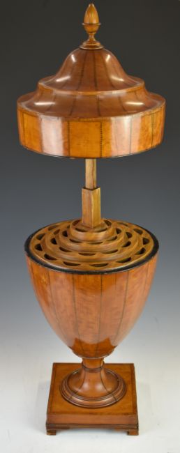 Georgian satinwood cutlery urn with ebonised feathered and string inlay, mahogany interior and extending telescopic cover, raised on a square base with bracket feet, diameter 58 x height 65cm (height with lid extended 84cm)