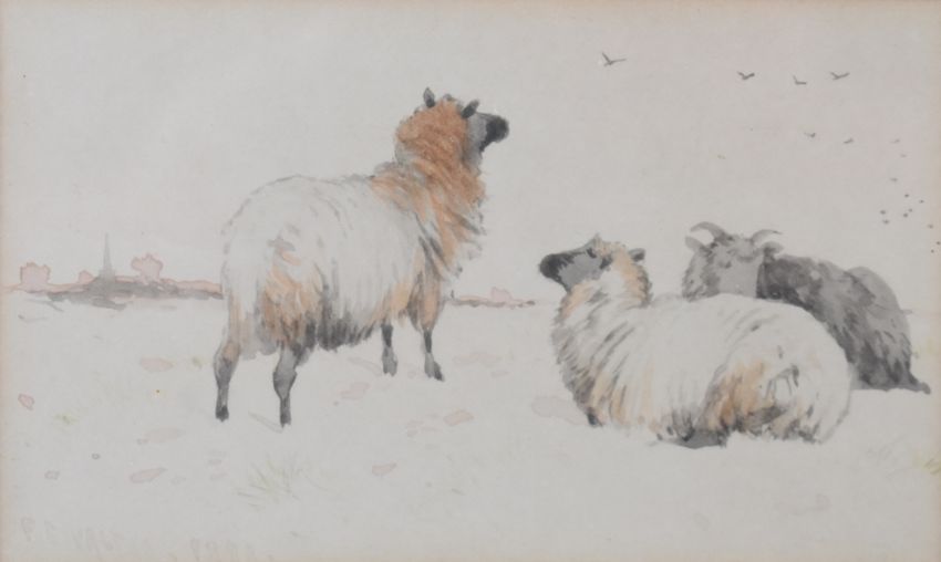 F E Valter pair of Victorian watercolours of sheep and cattle, both signed to lower edge, one dated 1888, 8.5 x 14cm, in gilt frames