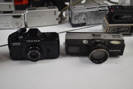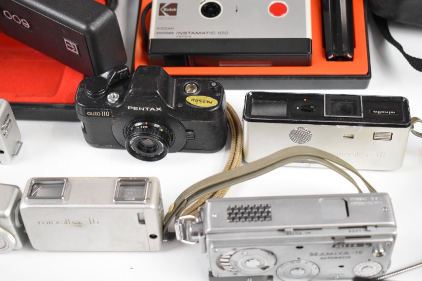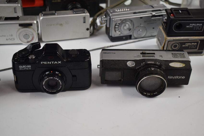 Fourteen miniature or spy cameras to include Minolta 110 zoom SLR,  Mamiya 16 automatic Minolta 16 MG, Pentax auto110 super, Minolta 16, Halina Micro 110, Minox Kodak etc