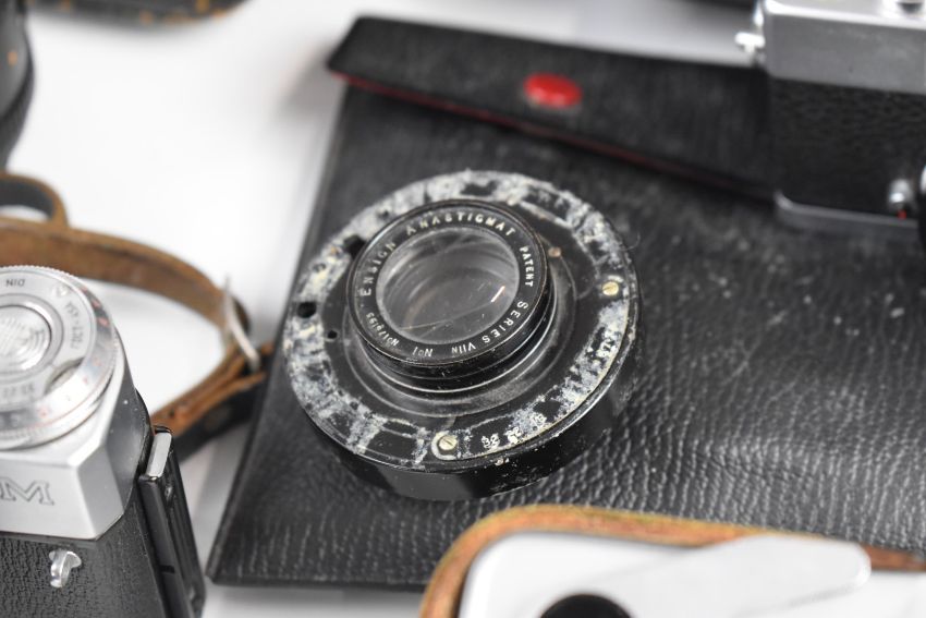 Collectable cameras to include Zenit EM 1980 Olympic SLR, Voigtlander folding camera, Rollei B35 and Pentax SP500