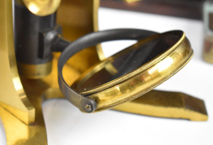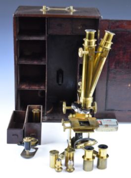 Victorian or early 20thC Baker of 244 High Holborn London binocular microscope, in mahogany carry case with two sets of eyepieces labelled A and B, and various lenses including A Ross 1856, Crouch London, cases including J.H.Steward 406 Strand and Smith & Beck, 6 Coleman Street, London and another lens with aperture fixture, height of case 40cm