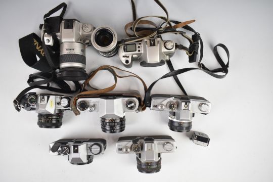 Seven 35mm SLR cameras comprising Canon A-1 program with 50mm 1:1.8 lens, Olympus OM20 body, Canonflex RP with 50mm and 135mm lenses, Minolta SRT100X with 1:1.7 55mm lens, Canon EOS500N body, Minolta SRT101 with 1:2 50mm lens and Minolta 404si with 28-80 lens