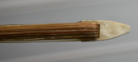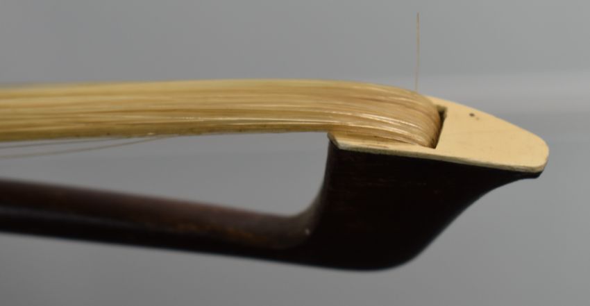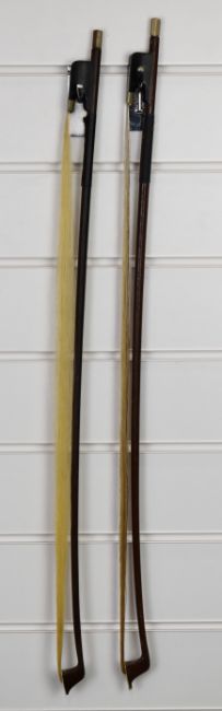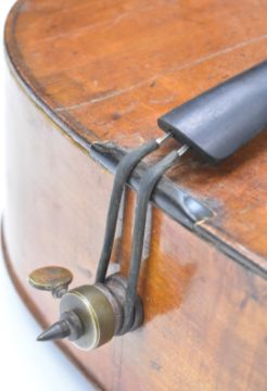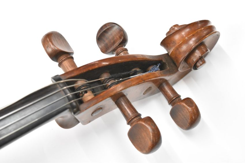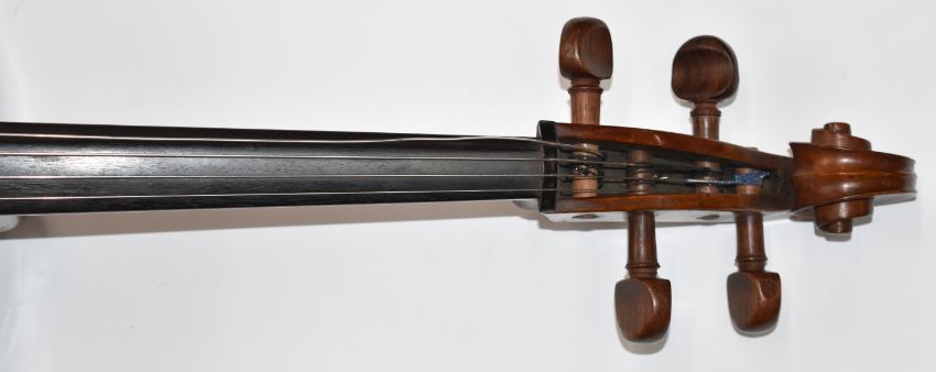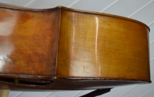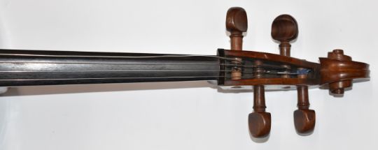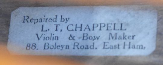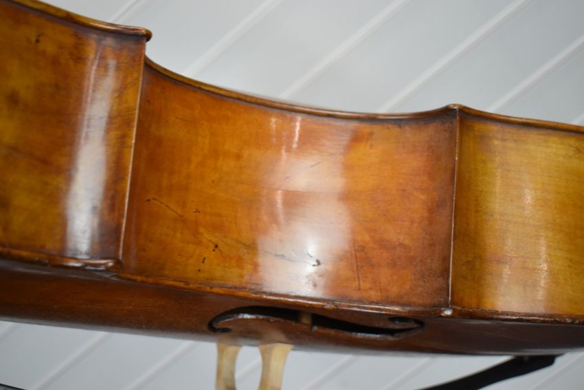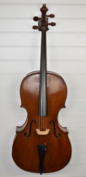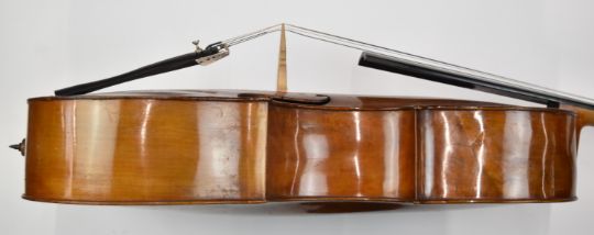 19thC single back cello with rosewood pegs, no maker's label, but label informing of repair at L.T. Chappell Violin & Bow maker, East Ham, with two bows and soft case. Body 73.5cm, lower bout 42.8cm, upper bout 33.3cm, shoulders to top of scroll 47cm. Bow 1 length 72cm, weight 80g, bow 2 length 70.7cm, weight 80g
