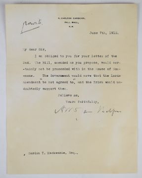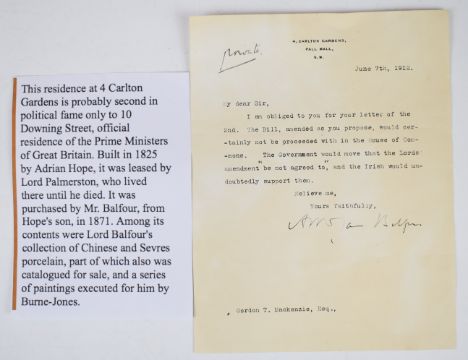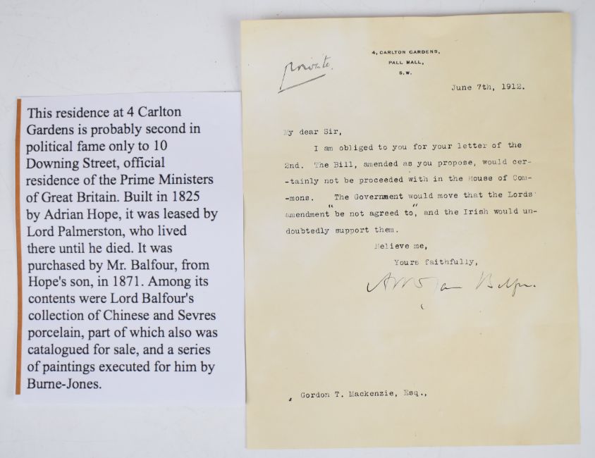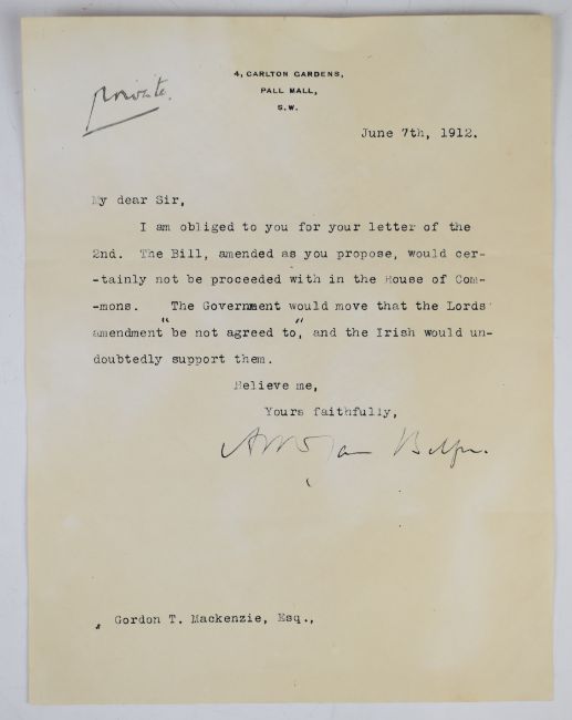 James Arthur Balfour (former British Prime Minister) signed typed letter of Irish / British political / social history interest regarding a Lords amendment 'not agreed to' and the Irish point of view